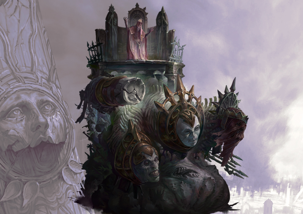 When the Theokrator emerged, it was in a storm of flailing limbs and warped, death-touched flesh. It moved akin to a gargantuan slug, heaving its terrifying bulk across the sand, yet was not nearly as slow as one would have hoped. Three great heads looked down upon the W’adrhŭn, while countless other smaller ones writhed and shifted across the aberration’s body. The horror was covered with too many writhing limbs, in the same manner a porcupine has quills, some diminutive and barely visible while others thick and lashing out with unholy strength. On the thing’s back sat a cursed shrine of sorts; Zuptak thought it to be one at least, and the ossified orator atop it spewed blood-chilling litanies while the cursed horror at its feet unleashed fresh violence across the field of battle. In truth, the priest himself was the one with the title of Theokrator, while the creature he lorded over was once of divine stock, now laid low and made to do his bidding… Zuptak and all of the W’adrhŭn present, however, lacked a way to know of such details; nor would they have cared if they were aware of the minutiae: to the warriors facing such an accursed horror, both master and indentured mount were to the W’adrhŭn one and the same, forming a singular enemy so vile that the mortal mind struggled to comprehend the mere sight of it.